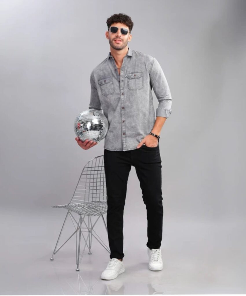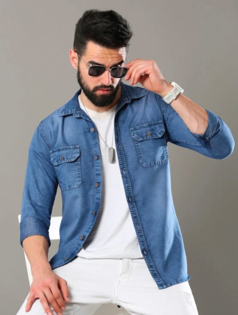 modern product description for a men’s full-sleeve denim shirt in a washed blue shade. The shirt features dual chest pockets with button flaps, a slim fit, and a casual vibe. It’s layered over a white crew-neck t-shirt and paired with ripped white jeans. Highlight the streetwear appeal, versatility, and layering potential. Tone: casual, confident, and trendy.”Level up your street style with this washed blue denim shirt – where rugged meets refined. Featuring full sleeves, dual buttoned chest pockets, and a tailored slim fit, it’s the ultimate layering piece for any casual-cool wardrobe. Whether you rock it open over a tee or buttoned up for a sharper edge, this shirt gives off effortless confidence. Perfect with white jeans or black joggers, it’s your go-to for weekend hangouts, date nights, or grabbing coffee with style.